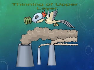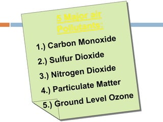 This document discusses air pollution, including its definition, classification, sources, and effects. It defines air pollution as the presence of unwanted particles and gases in the air that can adversely affect humans, plants, structures, and the environment. It then classifies air pollutants based on their origin (primary or secondary), state of matter (gaseous or particulate), and presence in the environment (indoor or outdoor). Common sources of air pollution are discussed, such as vehicles, industry, agriculture, and household activities. The document outlines some of the negative health, environmental, and infrastructure impacts of air pollution. Finally, it provides some potential solutions to control air pollution issues.