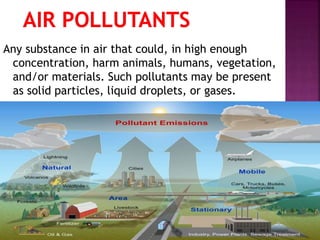 This document defines air pollution and discusses its sources and key pollutants. It identifies two main sources of air pollution as natural sources like volcanoes and fires, and anthropogenic or man-made sources from activities like burning fossil fuels and agriculture. The document categorizes major air pollutants as particulate matter, ozone, carbon monoxide, nitrogen dioxide, sulfur dioxide, and volatile organic compounds. It also distinguishes between primary pollutants emitted directly and secondary pollutants formed from chemical reactions of primary pollutants in the atmosphere.