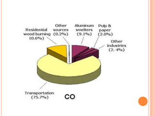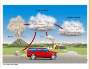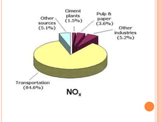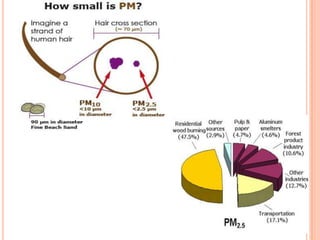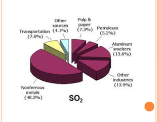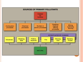 The document provides a comprehensive overview of air pollution, including its definitions, sources, and effects on human health, plants, and materials. It categorizes air pollutants into primary and secondary pollutants and discusses various control measures and equipment for mitigating air pollution. Additionally, the document outlines regulatory measures and prevention strategies for reducing air pollution impacts.