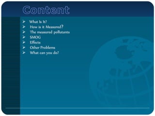 The document discusses air quality, including definitions and examples of natural and unnatural pollutants, as well as the Air Quality Index (AQI) which indicates health concerns based on pollutant levels. Major pollutants include carbon monoxide, sulfur dioxide, nitrogen dioxide, particulate matter, and ground-level ozone, each with specified health impacts. Strategies for reducing pollution, such as biking, carpooling, and public transportation, are also suggested.