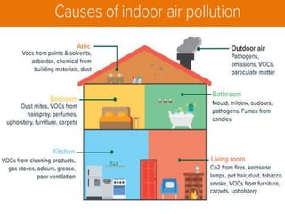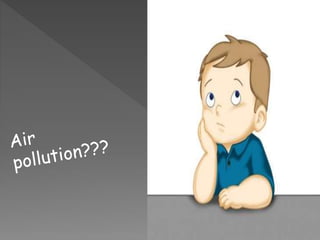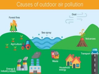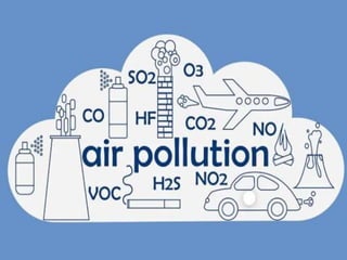 This document discusses the types and causes of air pollution, the problems it creates for humans, the environment and the planet, and potential remedies. It notes that air pollution negatively impacts human health, causes acid rain and eutrophication of water sources, depletes the ozone layer, and contributes to climate change. The document suggests finding remedies is important as air pollution continues to worsen global conditions.