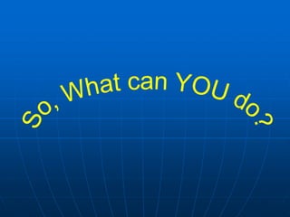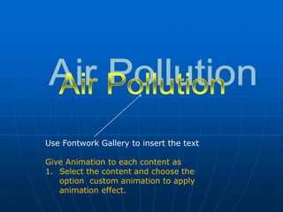 3. The document provides tips for reducing air pollution such as biking, encouraging carpooling, turning off lights when not in use, and joining groups that work to stop pollution.