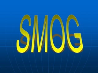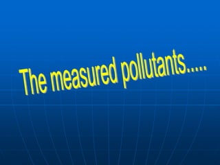 1. The document discusses various types of air pollution including carbon monoxide, sulfur dioxide, nitrogen dioxide, particulate matter, ground-level ozone, and smog.