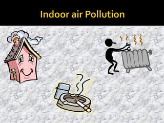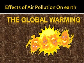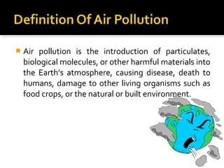 The document discusses air pollution, highlighting five major pollutants: carbon monoxide, sulfur dioxide, nitrogen dioxide, particulate matter, and ground-level ozone, along with their sources and health effects. It explains the greenhouse effect caused by excess carbon dioxide, leading to global warming and impacts like melting ice caps. The document emphasizes taking action to reduce pollution and improve air quality through energy-saving tips and community engagement.