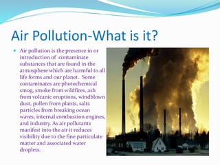 The document discusses air pollution, including its definition, sources, locations, and effects. It notes that air pollution is the introduction of contaminants into the atmosphere that harm life and the environment. Major sources include vehicle emissions, industry, and wildfires. Areas with high population and industry levels experience worse air pollution. The effects of air pollution include negative impacts on human health like respiratory illness as well as environmental damage such as acid rain. Solutions proposed to address air pollution include transitioning to renewable energy sources and adopting more sustainable practices.