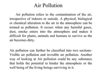 Air pollution refers to contamination of the air indoors or outdoors by harmful gases, dust, or smoke. It occurs when substances enter the atmosphere and make it difficult for plants, animals, and humans to survive by making the air dirty. Major causes of air pollution include burning fossil fuels for energy and transportation, agricultural activities, exhaust from factories and industries, and mining operations. The effects of air pollution are severe and include respiratory and heart problems, global warming, acid rain, eutrophication of water bodies, and damage to wildlife. Urgent action is needed to control air pollution and mitigate its harmful impacts.
