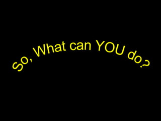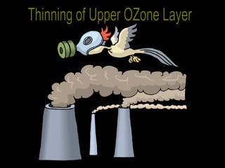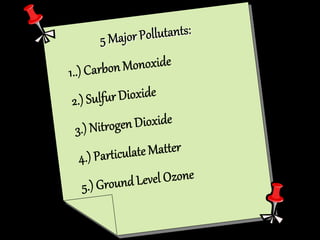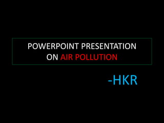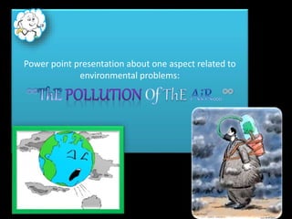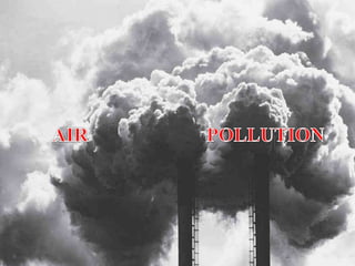 The document is a PowerPoint presentation about air pollution. It defines air pollution and discusses the main types, including smog, acid rain, the greenhouse effect, and holes in the ozone layer. It explains the health effects of major air pollutants like carbon monoxide, sulfur dioxide, nitrogen dioxide, particulate matter, and ground-level ozone. While air pollution poses risks, individuals can take steps to reduce pollution and promote clean energy through choices in transportation, appliances, and lifestyle. Community engagement through education and public events can also help address the issue.