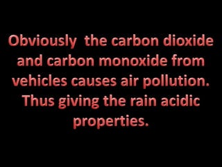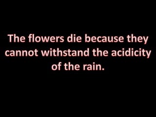 Air pollution from vehicles, factories, and construction releases carbon dioxide and carbon monoxide into the air, causing rain to become acidic and killing flowers that cannot withstand the acidity. Air pollution also negatively impacts health by exacerbating asthma, pneumonia, and lung function. Everyone should take responsibility to reduce air pollution and protect the environment.