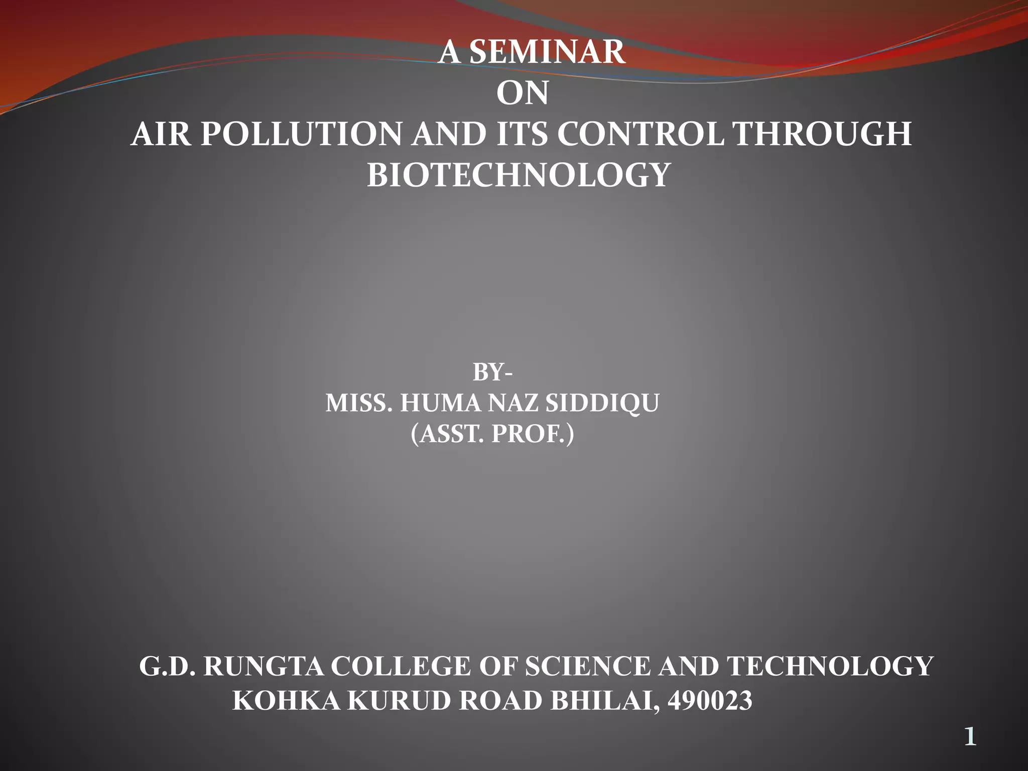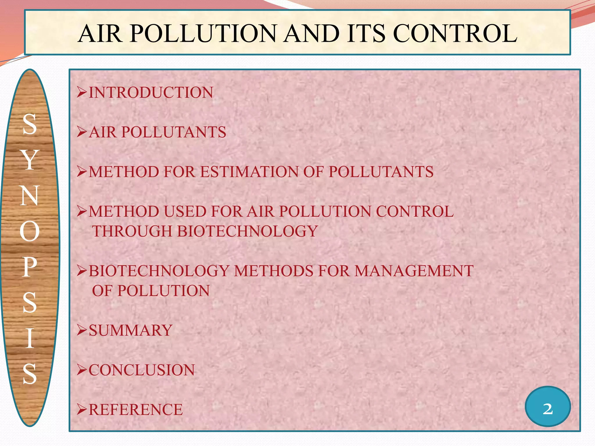 The document discusses air pollution and its control through biotechnology. It begins with an introduction to air pollution, listing common air pollutants such as particulates and gaseous pollutants. It then describes several methods for estimating pollutants and controlling air pollution, including the use of biotechnology approaches like microalgal photosynthesis and biological calcification to reduce carbon dioxide in the atmosphere. The document concludes with a summary of the causes and impacts of air pollution and the need for continued control efforts.