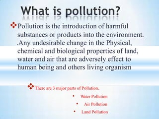 This document discusses various types of air pollution including their sources and effects. It defines air pollution as atmospheric conditions produced by certain substances in concentrations that adversely affect humans and the environment. The major sources of air pollution include natural sources like volcanoes and man-made sources such as factories and automobiles. Primary pollutants are emitted directly while secondary pollutants form when primary pollutants interact chemically or physically in the air. The document outlines several primary and secondary air pollutants and their health effects. It concludes with some measures that can be taken to reduce air pollution.
