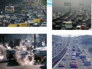 Pollution is the effect of undesirable changes in the environment that harm plants, animals, and humans. There are many types of pollution including air, water, soil, noise, and thermal nuclear pollution. Humans are the main cause of pollution through industry, transportation, and other activities that release harmful gases, chemicals, and waste products into the air, water, and land. Pollution has detrimental health effects and impacts the environment and climate. Various strategies can be taken to reduce pollution and improve air quality.