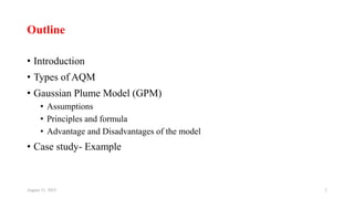 This document discusses a one-dimensional point source air pollution steady state model, focusing specifically on the Gaussian plume model (GPM) for air quality modeling. It outlines key assumptions, model principles, advantages and disadvantages, and presents a case study analyzing pollutant concentration from a factory affecting nearby residential areas. The study involves detailed modeling steps to estimate pollutant dispersion based on various meteorological and emission parameters.