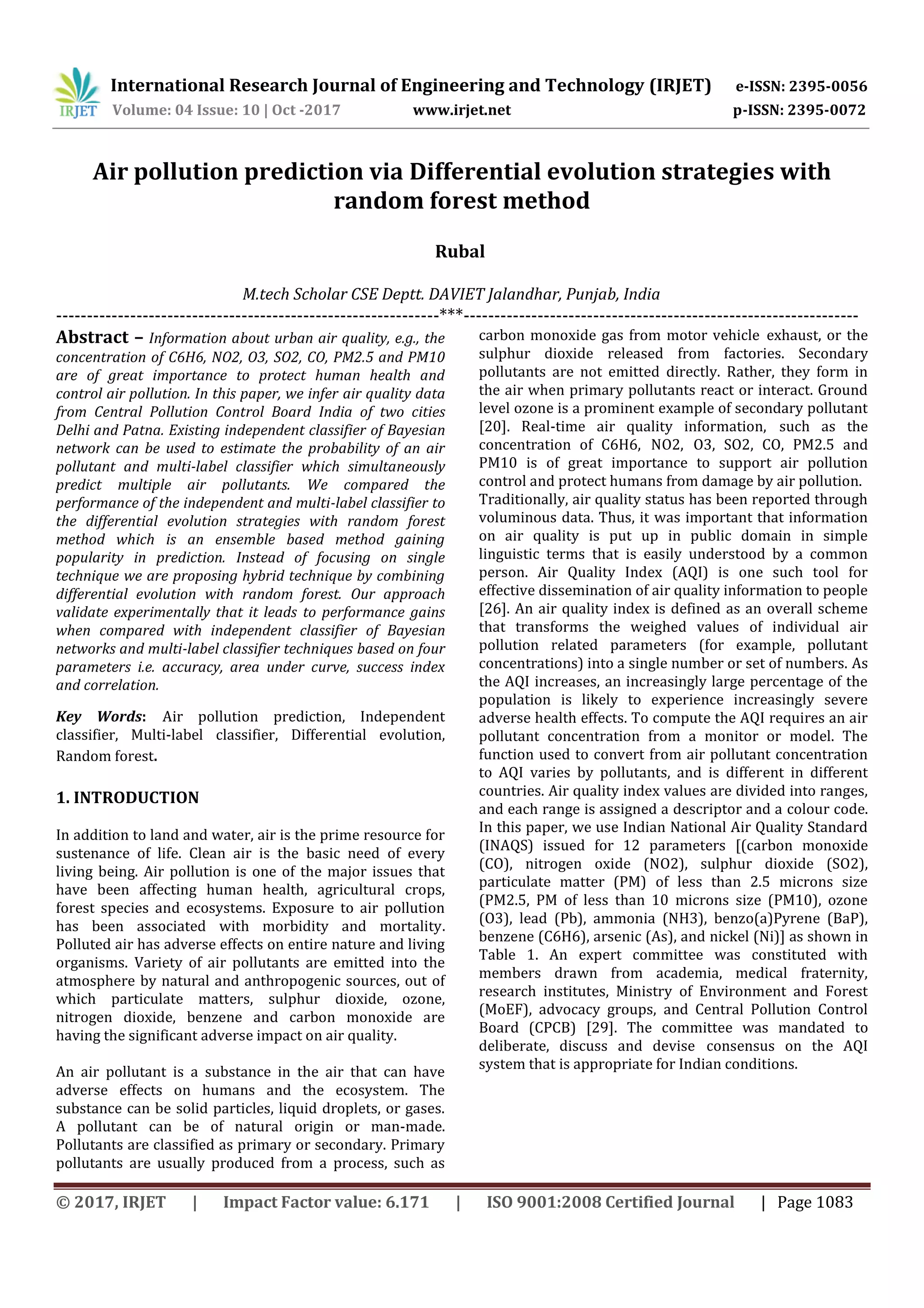 This document discusses using a hybrid machine learning technique combining differential evolution and random forest methods to predict air pollution levels. It analyzes data on various pollutants from two cities in India - Delhi and Patna. The proposed approach is experimentally validated to achieve better performance compared to independent classifiers and multi-label classifiers in terms of accuracy, area under the curve, success index and correlation. Differential evolution is used to initialize population and optimize candidate solutions. Random forest creates an ensemble of decision trees to make predictions. The hybrid method is tested on predicting carbon monoxide, nitrogen dioxide and benzene levels using data from a monitoring station in Delhi.