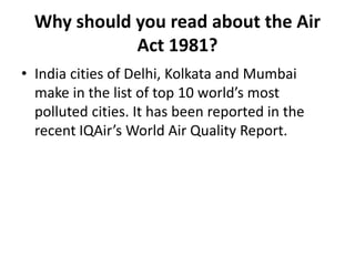 The Air (Prevention and Control of Pollution) Act of 1981 was enacted in India to address rising air pollution issues from factors such as improper industrial practices and environmental conditions. It established a Central Pollution Control Board and State Pollution Control Boards to regulate air pollution. The boards are empowered to declare air pollution control areas, prohibit fuels that cause pollution, issue directions on emission standards, and plan and execute air pollution prevention programs. The Act also defined key terms around air pollution and outlines the roles and responsibilities of the central and state pollution control boards.