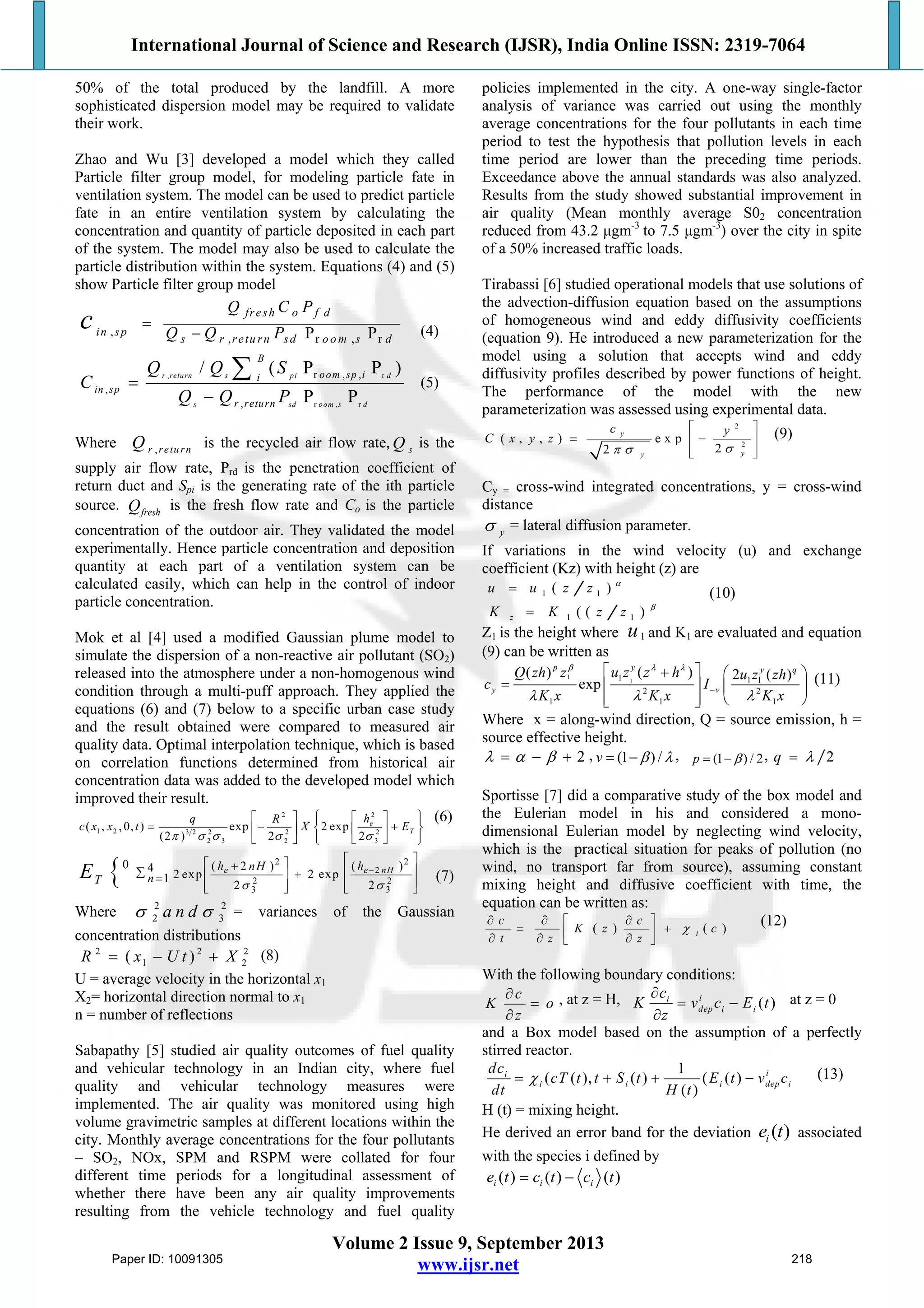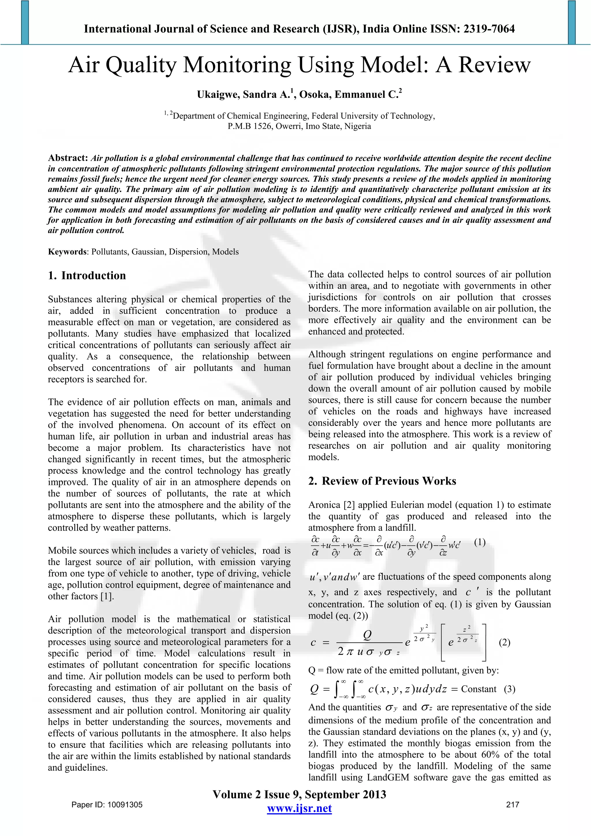 This document reviews various models for monitoring air quality, emphasizing the need for accurate characterization of pollutant emissions and their dispersion. It explores different modeling approaches, such as Gaussian plume and box models, highlighting their applications, advantages, and limitations in predicting and assessing air pollution. The study underscores the importance of ongoing research and improved modeling techniques to enhance air quality management and control.