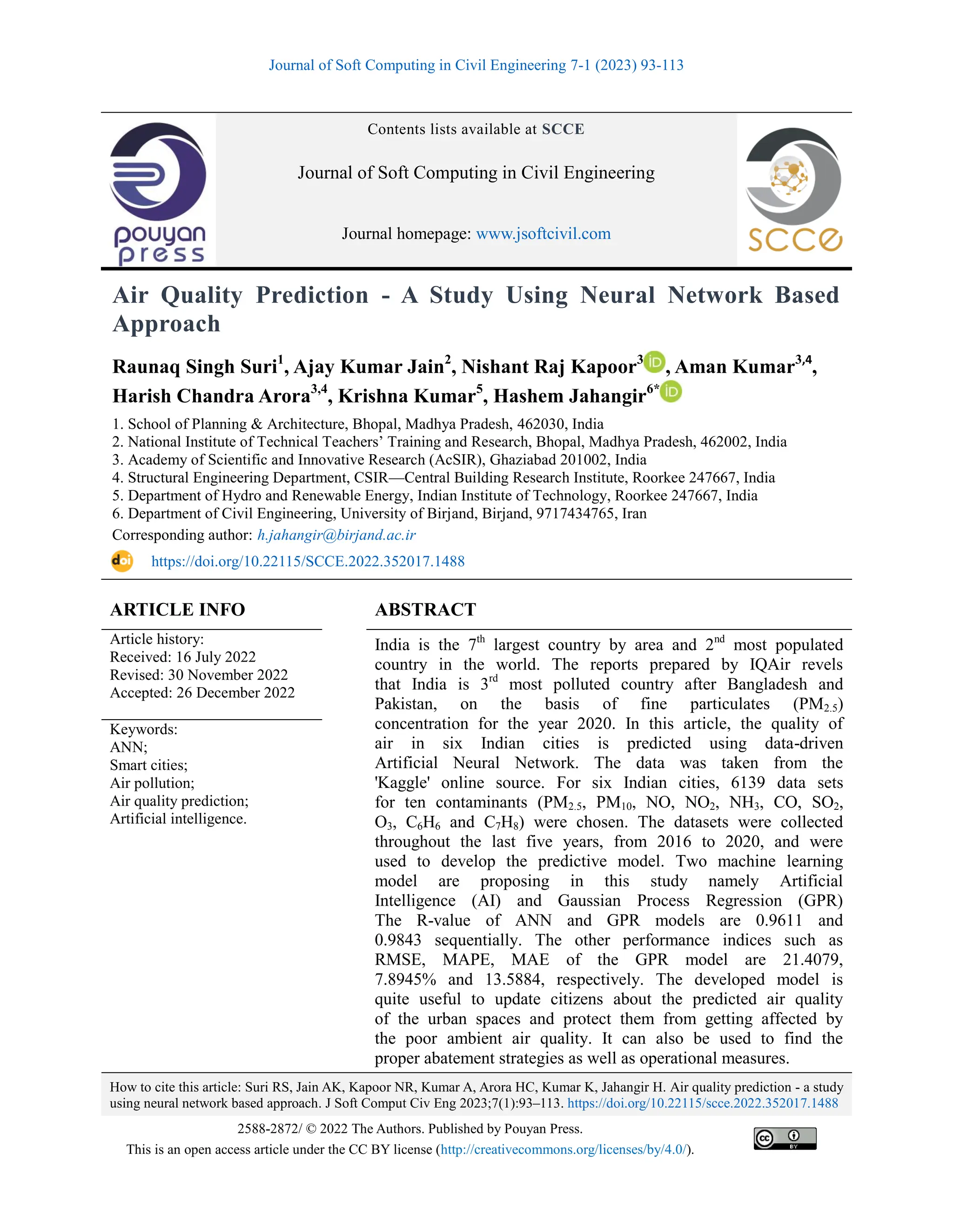 India is the 7th largest country by area and 2nd most populated country in the world. The reports prepared by IQAir revels that India is 3rd most polluted country after Bangladesh and Pakistan, on the basis of fine particulates (PM2.5) concentration for the year 2020. In this article, the quality of air in six Indian cities is predicted using data-driven Artificial Neural Network. The data was taken from the 'Kaggle' online source. For six Indian cities, 6139 data sets for ten contaminants (PM2.5, PM10, NO, NO2, NH3, CO, SO2, O3, C6H6 and C7H8) were chosen. The datasets were collected throughout the last five years, from 2016 to 2020, and were used to develop the predictive model. Two machine learning model are proposing in this study namely Artificial Intelligence (AI) and Gaussian Process Regression (GPR) The R-value of ANN and GPR models are 0.9611 and 0.9843 sequentially. The other performance indices such as RMSE, MAPE, MAE of the GPR model are 21.4079, 7.8945% and 13.5884, respectively. The developed model is quite useful to update citizens about the predicted air quality of the urban spaces and protect them from getting affected by the poor ambient air quality. It can also be used to find the proper abatement strategies as well as operational measures.