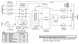 The document provides a comprehensive overview of air separation techniques, focusing primarily on cryogenic distillation, which is the most common method for obtaining high-purity nitrogen, oxygen, and argon from atmospheric air. It details the process of cooling and distilling air, emphasizing the energy-intensive nature of the operation and the need for advanced heat integration. Alternative methods, such as pressure swing adsorption and membrane technologies, are also mentioned, which can serve different applications including medical uses and aviation safety.