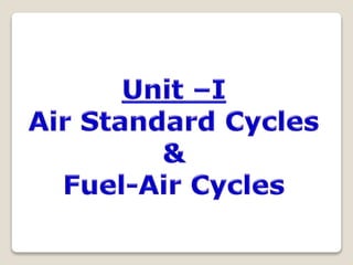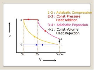 The document outlines the four-stroke engine cycle, detailing the four distinct stages: intake, compression, combustion, and exhaust, with explanations of valve operations during each phase. It also discusses theoretical analyses of internal combustion engine cycles, emphasizing the importance of simplifying assumptions such as treating the working medium as an ideal gas. Additionally, the document compares different engine cycles, including Otto and Diesel cycles, providing insights into their efficiencies and operational principles.
