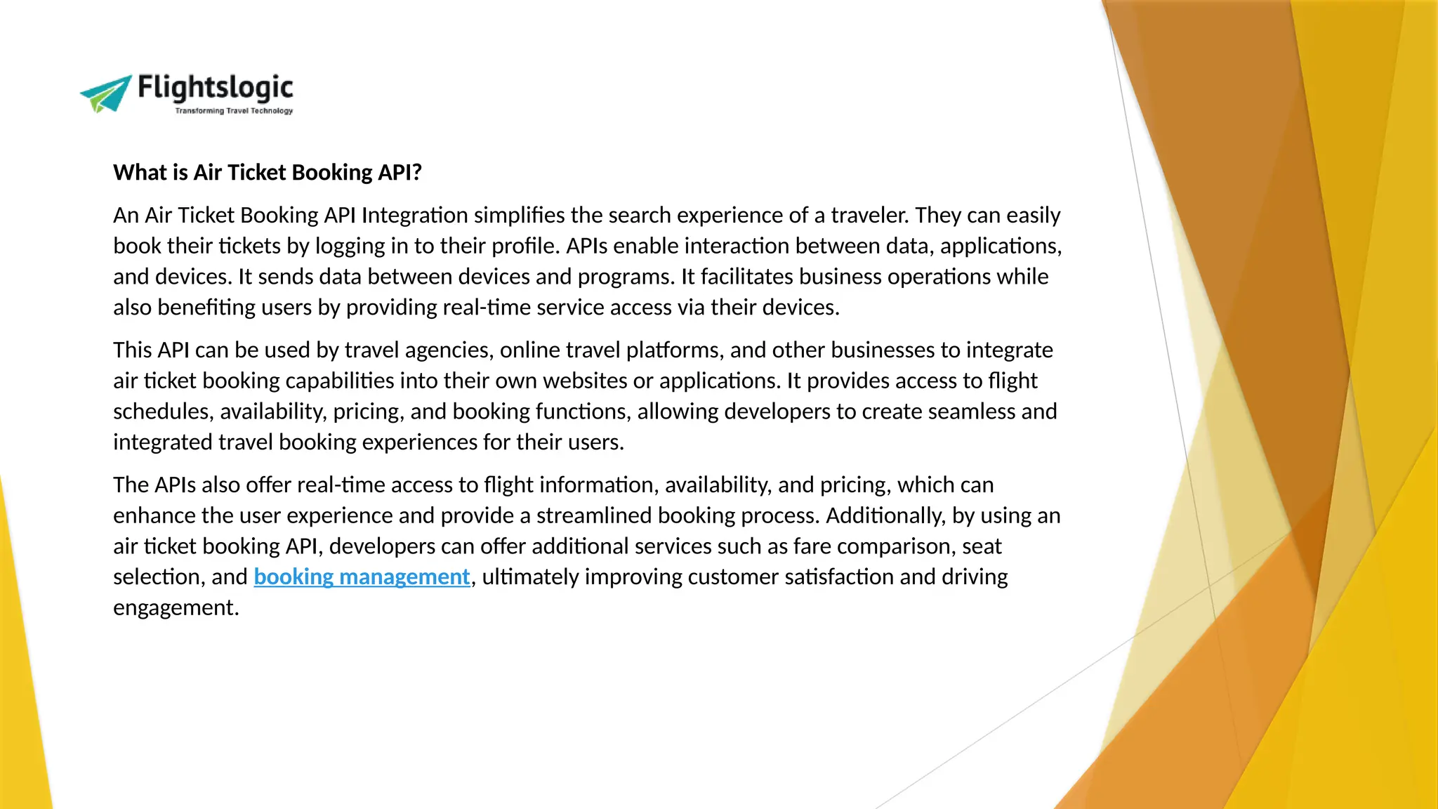 The air ticket booking API provides a streamlined solution for travelers to easily search and book flights through various platforms, offering access to flight schedules, pricing, and real-time availability. Flightslogic is a leading provider that enhances online travel business capabilities by integrating complex functionalities such as dynamic pricing, multi-city bookings, and payment gateways. This API integration improves customer satisfaction and business efficiency by consolidating services and reducing operational costs.