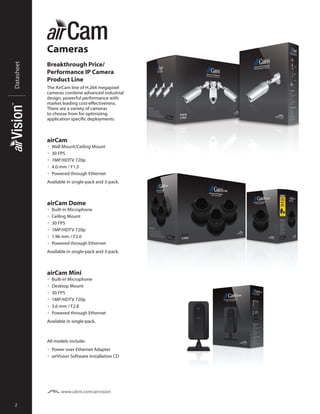 - The system includes IP cameras (airCam, airCam Dome, airCam Mini), management software, and analytics capabilities.