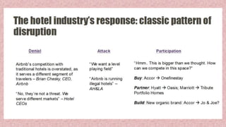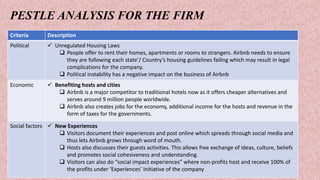 Airbnb conducted a PESTLE analysis to understand the political, economic, social, technological, legal and environmental factors impacting their business. Politically, they must ensure hosts comply with housing laws. Economically, Airbnb benefits hosts and cities by offering cheaper accommodations than hotels. Socially, guests share experiences on social media which helps Airbnb grow through word-of-mouth. Technologically, Airbnb relies heavily on their app and website to operate. Legally, hosts must agree to terms ensuring compliance with regulations. Environmentally, studies show Airbnb has a smaller carbon footprint than hotels.