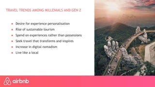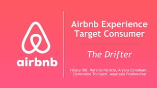 This document analyzes the target consumer profile for Airbnb Experiences, which are activities and local experiences offered through the platform. It identifies the key demographic as 18-34 year old, single, educated females from Europe and the Americas on a budget who enjoy cultural experiences. This profile is referred to as "drifters". The document also finds that while many drifters are open to new experiences and brands, about half are unaware of Airbnb Experiences. It suggests Airbnb could better communicate the value of Experiences and categorize them more clearly for tourists versus locals.