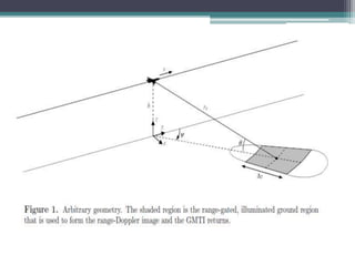 Airborne radar systems installed in aircraft can detect objects at long ranges and support air combat operations. There are four main types of airborne radar: radar altimeter to measure height above ground, weather radar to detect precipitation, terrain mapping radar, and ground moving target indication radar. Weather radar emits radio waves that reflect off rain droplets and snow crystals, displaying them in color-coded levels of reflectivity on the cockpit display. Pilots use controls to adjust the radar range, gain, and tilt to optimize weather detection and avoidance.