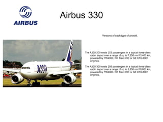 The document summarizes Airbus's long range aircraft fleet, including the A330, A340, A380, and the new A350. It provides details on the passenger capacity and range of different versions within each aircraft type, which are powered by various engine options. It also mentions that airlines are changing their fleets to include more short and long range aircraft, using common hubs to reduce costs and increase efficiency.