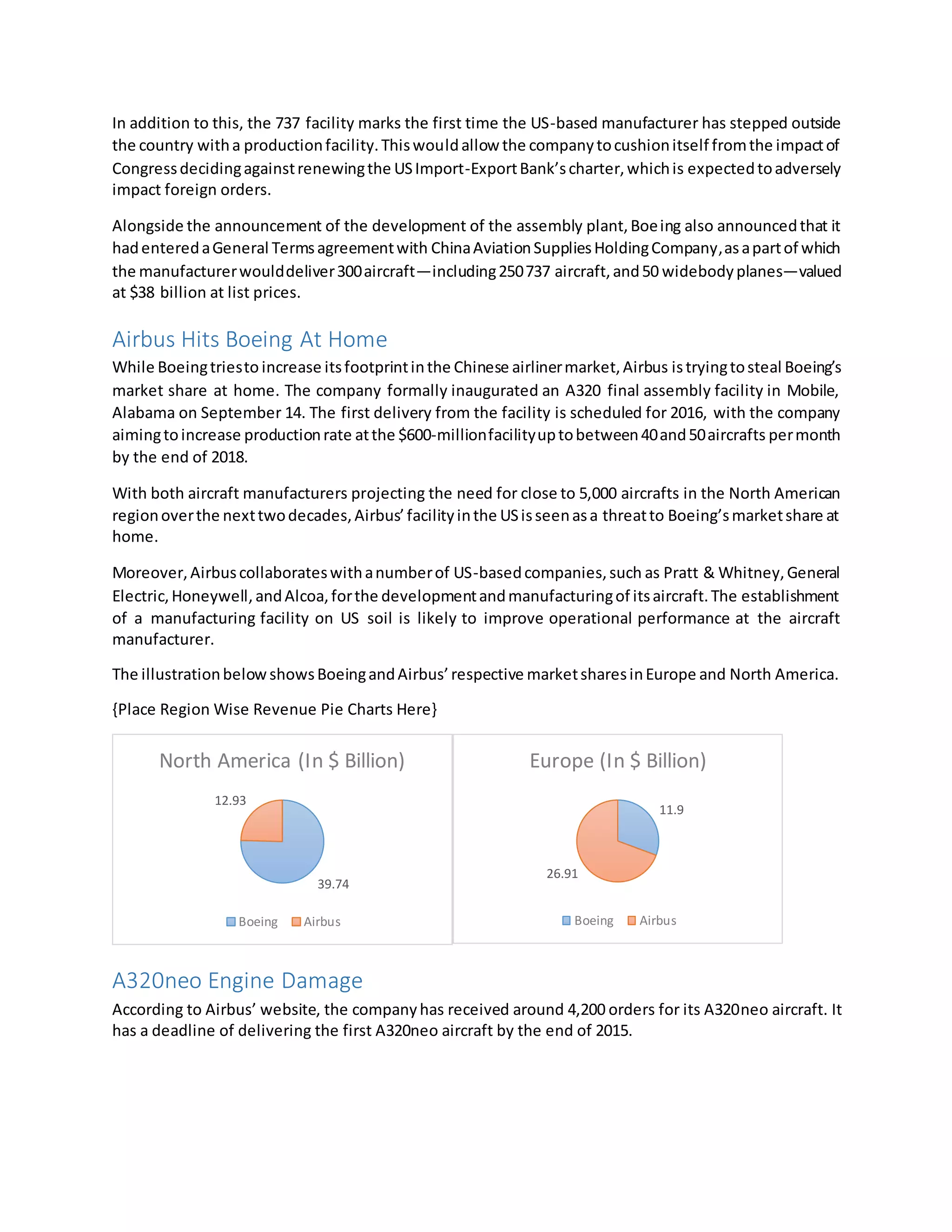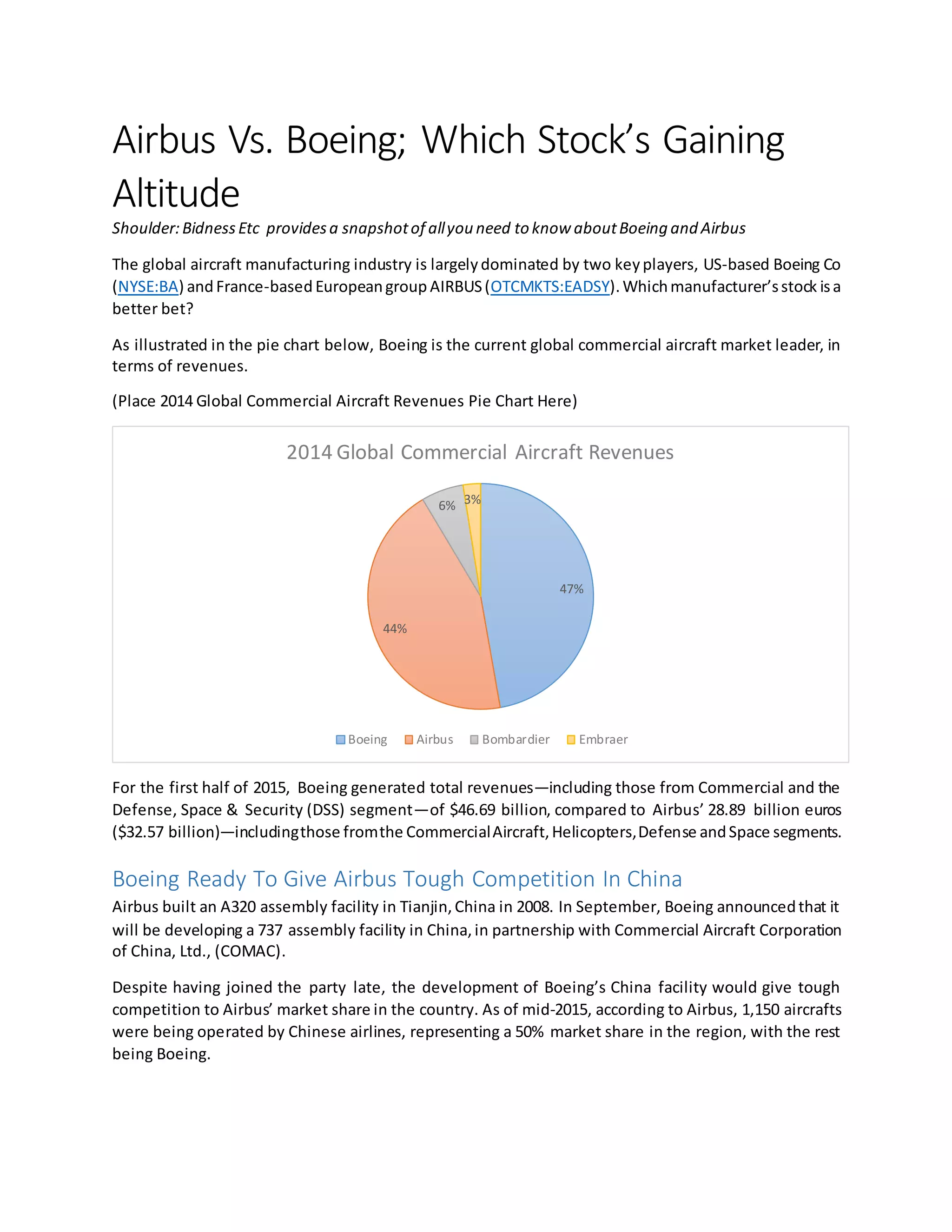 Boeing and Airbus are the two dominant manufacturers in the global aircraft industry. While Boeing currently has a larger market share and generated higher revenues in the first half of 2015, Airbus has received more net orders so far in 2015 with 815 orders compared to Boeing's 447. Both companies are taking steps to grow their presence in important markets - Boeing is developing its first aircraft assembly facility in China, while Airbus opened a new facility in the US. However, Airbus faces pressure to meet its deadline to deliver the first A320neo aircraft by the end of 2015 after engine problems caused further delays in testing. Overall, while Boeing's financial performance has improved, Airbus has a larger backlog of orders that will support