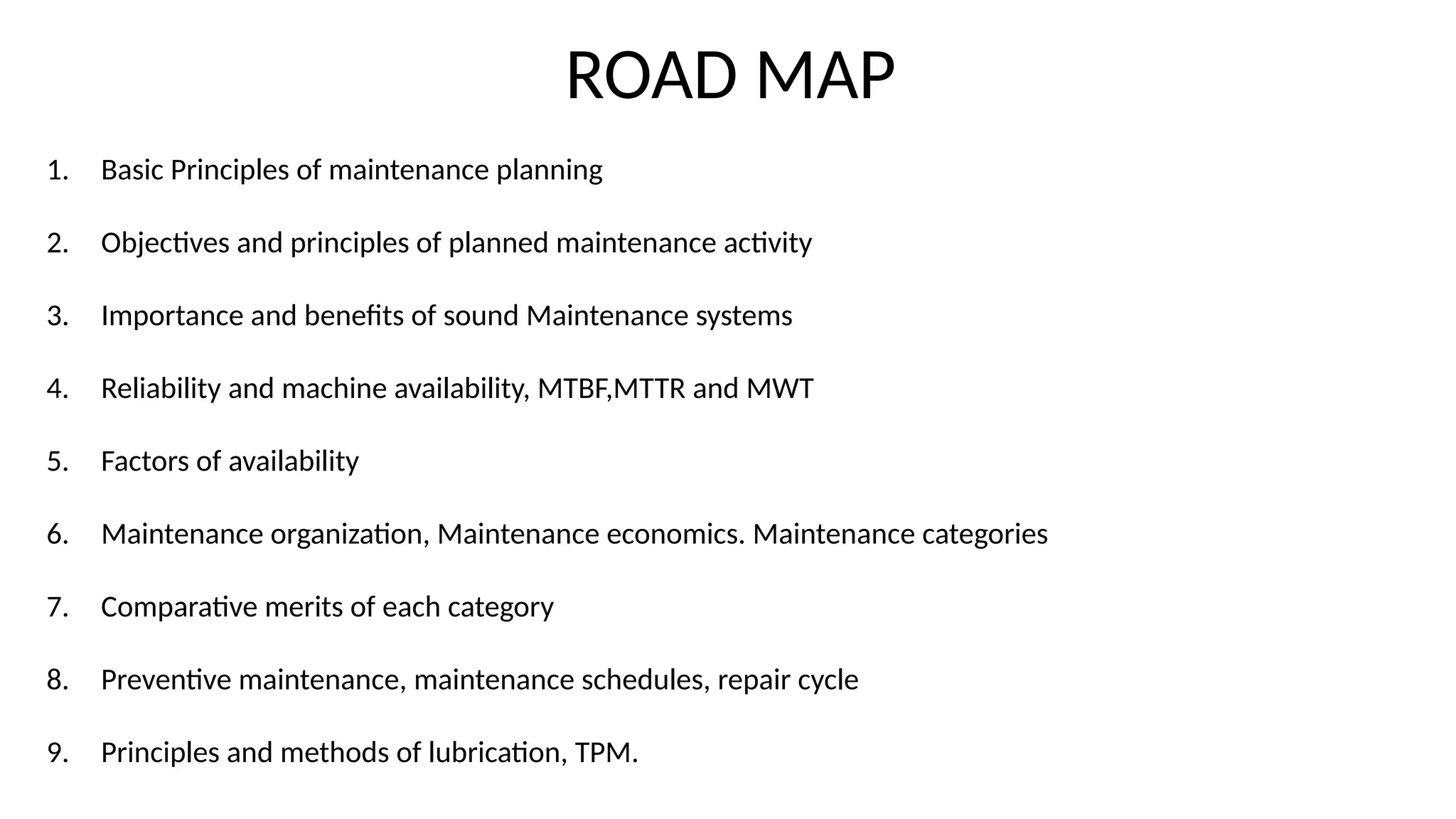 The document outlines the principles and practices of maintenance engineering, focusing on the importance of planned maintenance activities to achieve machine reliability and availability. It emphasizes the need for effective maintenance planning, preventative maintenance strategies, and the benefits of sound maintenance systems, such as cost reduction and improved equipment lifespan. Additionally, it discusses the role of maintenance organizations in achieving optimal operational conditions and the evaluation of their effectiveness in minimizing production disruptions.