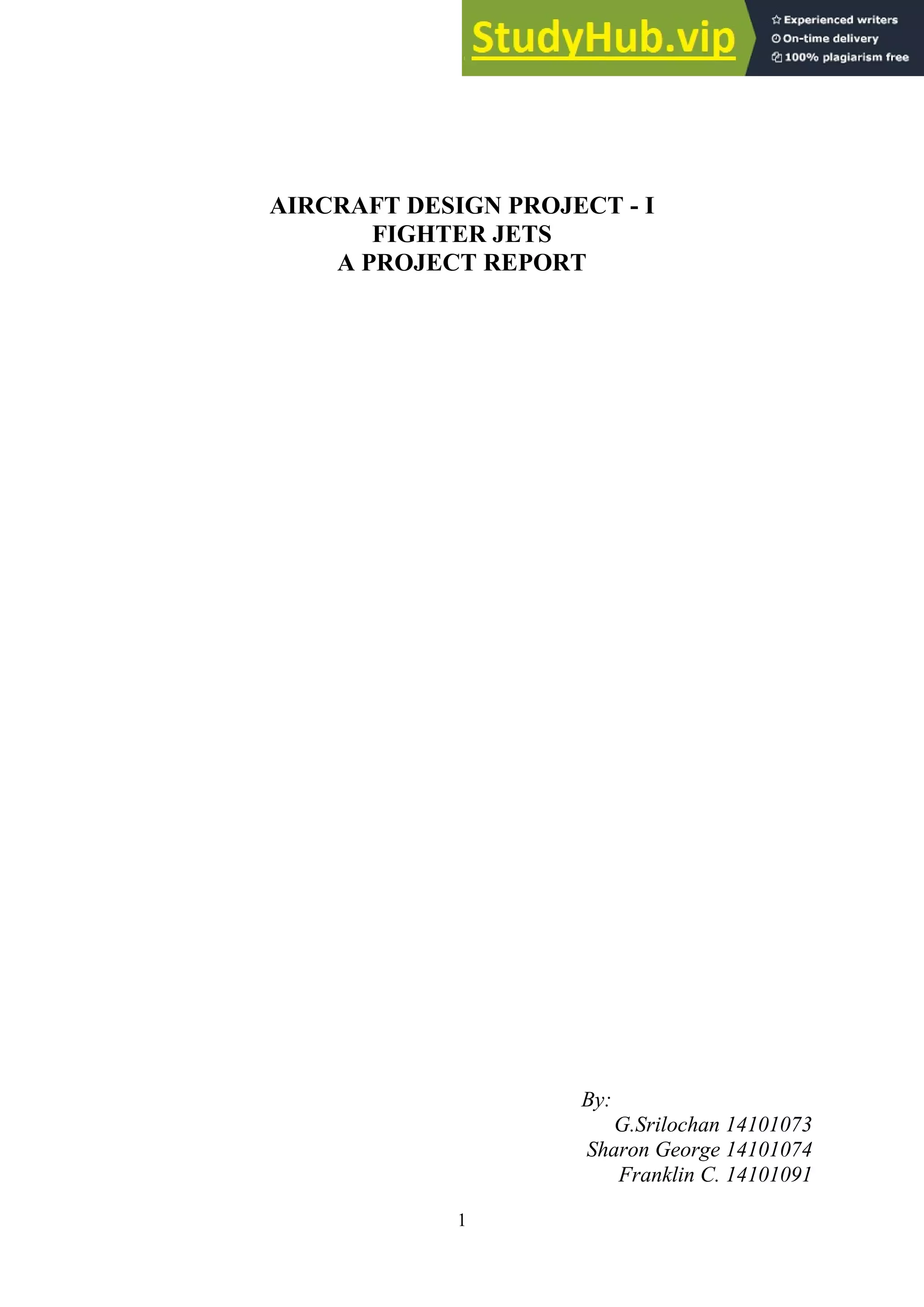 This document provides an overview of the design process for a fighter jet aircraft project. It includes acknowledgements, an abstract, table of contents, and sections on introduction to design, aircraft introduction, comparative details and graphs, weight estimation, airfoil and wing selection, tail plane, landing gear, power plant selection, drag estimation, V-N diagram, 3 view diagram, final parameters, and conclusion. The project involves students conceptualizing and designing a fighter jet to meet performance specifications while allowing for weapon carriage, efficiency, and reduced emissions.