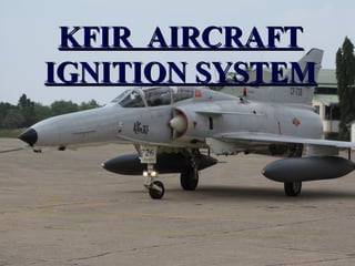 The ignition system of the Kfir aircraft comprises two ignition units and an afterburner ignition system. The ignition units convert 28V DC power to high voltage pulses to spark the main igniter plugs. Ignition unit 1 additionally powers the afterburner igniter plug. When switches are closed, the units charge capacitors and generate sparks to ignite fuel mixtures. The system ensures ignition during normal operation and allows for re-ignition in an engine failure.