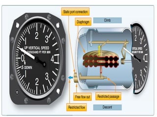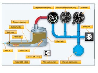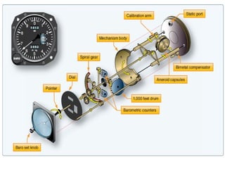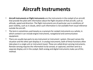 The document discusses aircraft instrument systems. It describes the main types of instruments including flight instruments, engine instruments, and navigation instruments. It explains that flight instruments like the altimeter, airspeed indicator, and magnetic compass provide pilots with critical flight information. Engine instruments monitor parameters like fuel, oil, temperatures, and speeds. Navigation instruments help pilots navigate along a course and for approaches. Pressure measuring instruments are also discussed, with details on how Bourdon tubes are commonly used to sense and measure pressure in aircraft.