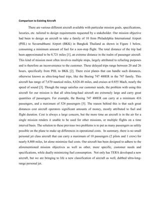 This document provides a final project report for the design of the Dragonfly Mk. I aircraft by TERA (Tyler, Elliot, Robert Aerospace). It summarizes the comparison to existing aircraft, the design requirements and specifications, and provides justifications for design elements like the wing loading, thrust-to-weight ratio, and T-tail configuration. The goal was to design a small personal jet capable of carrying 10 passengers for nearly 8,800 miles between Philadelphia and Bangkok, Thailand with minimized fuel consumption.