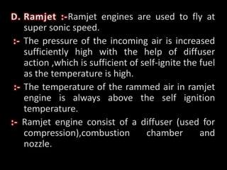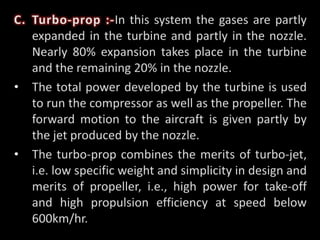 Jet propulsion systems use gas turbines for aircraft propulsion. Gas turbines are light, compact, and have a high power-to-weight ratio. They operate on an open cycle where air is compressed, mixed with fuel and combusted, and the hot gases are expanded to produce thrust. Common jet propulsion systems include turbojets, turbofans, and turboprops which partially or fully expand combustion gases in a turbine before exiting through a nozzle.
