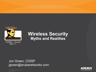 This document discusses myths and realities about wireless network security. It begins by addressing common misconceptions, such as that wireless networks cannot be secured, wired networks are more secure, and that simple techniques like disabling the SSID broadcast provide adequate security. It then explains why these views are myths and why proper security requires centralization, authentication, encryption, authorization, and other best practices. The document advocates an approach following principles of defense in depth and least privilege to provide robust security for wireless networks.