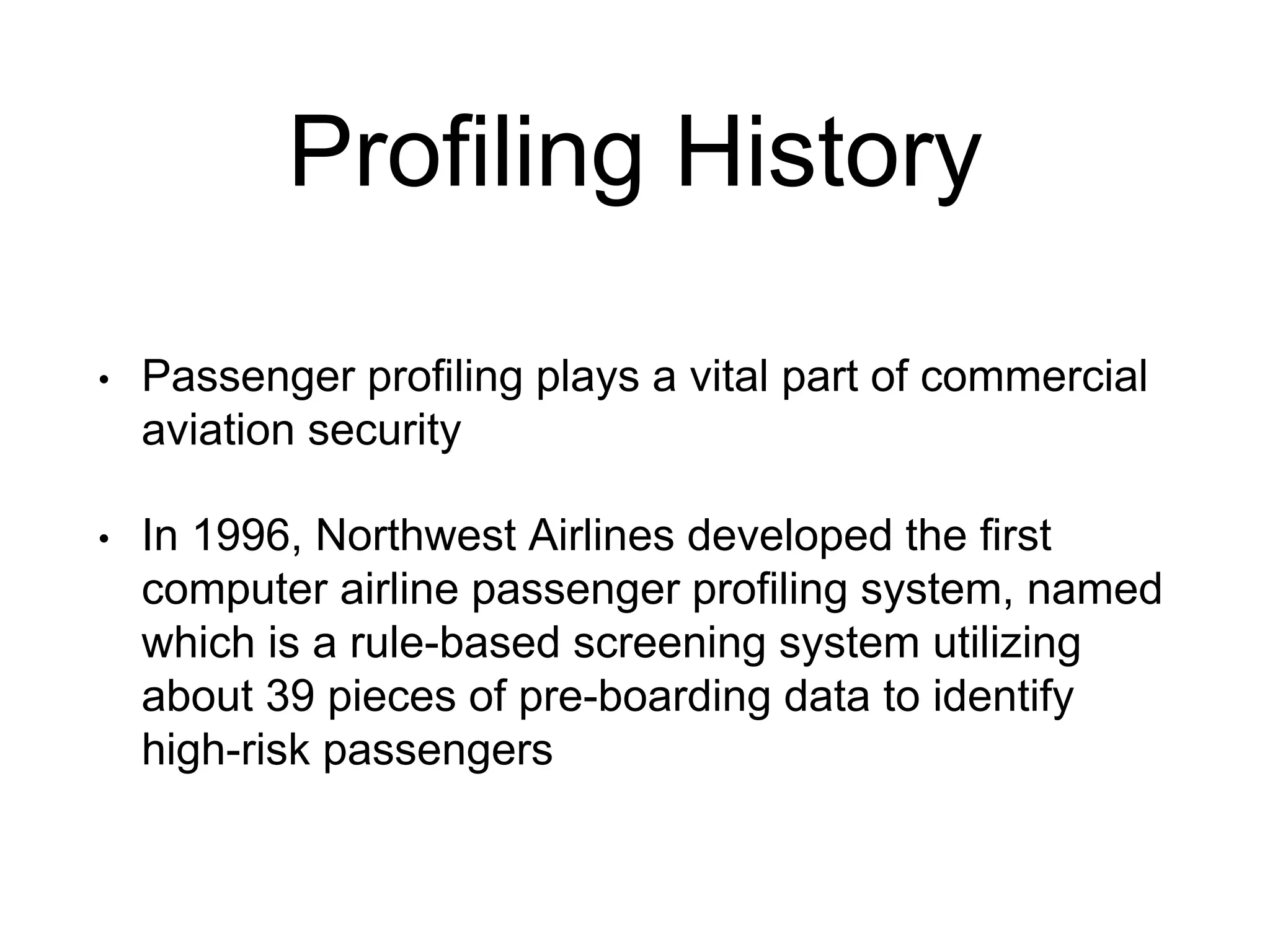 The document discusses airline passenger profiling using fuzzy deep machine learning, emphasizing its importance for aviation security, particularly after 9/11. It highlights the evolution of profiling systems from initial rule-based methods to advanced systems like CAPPS II and Secure Flight, while addressing the inefficiencies and challenges of current methods. The proposed solution involves a Pythagorean fuzzy deep Boltzmann machine (PFDBM) for improved classification accuracy of normal passengers versus potential attackers, integrating various data sources for training.