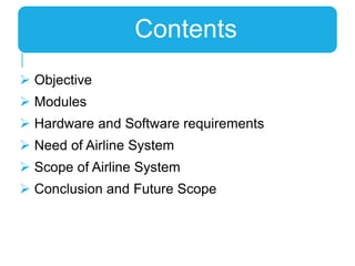 The document outlines a presentation on an airline reservation system (ARS) developed by Euro Travel, detailing its objectives, modules, hardware and software requirements, and the need for such a system. The ARS allows passengers to register, book tickets, and view flight schedules while providing a user-friendly interface for administrators to manage airline operations. Overall, the system facilitates easy online ticket reservations, enhancing convenience for travelers.
