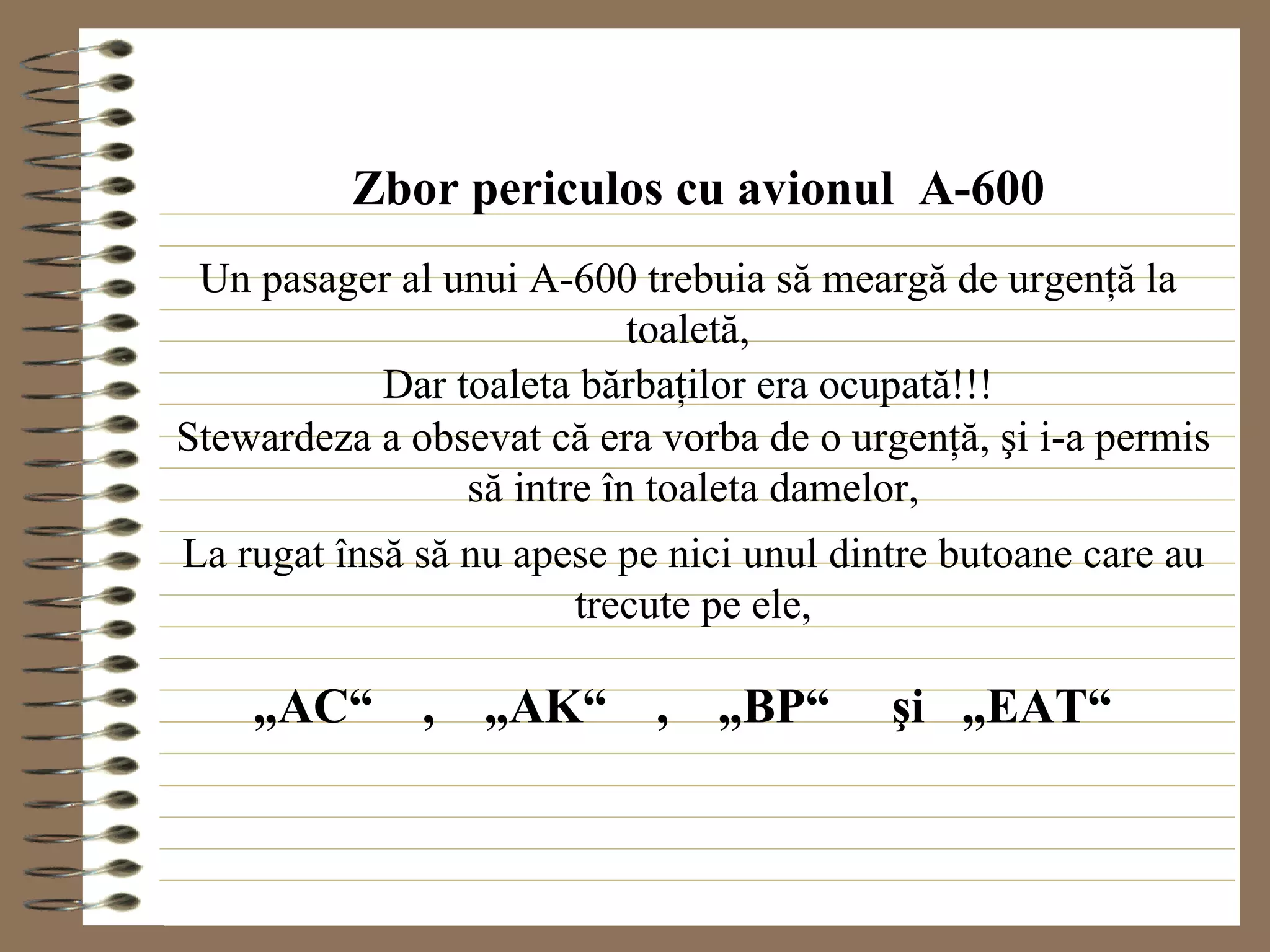 Un pasager al avionului A-600 a avut o urgență și a fost direcționat către toaleta damelor, unde a apăsat pe mai multe butoane interzise. După ce a experimentat un serviciu impresionant de curățare, a activat accidental un buton care a dus la o situație periculoasă. A fost ulterior dus la spital, unde a aflat că nu era niciun pericol cu avionul, dar a avut de suferit din cauza curiozității sale.