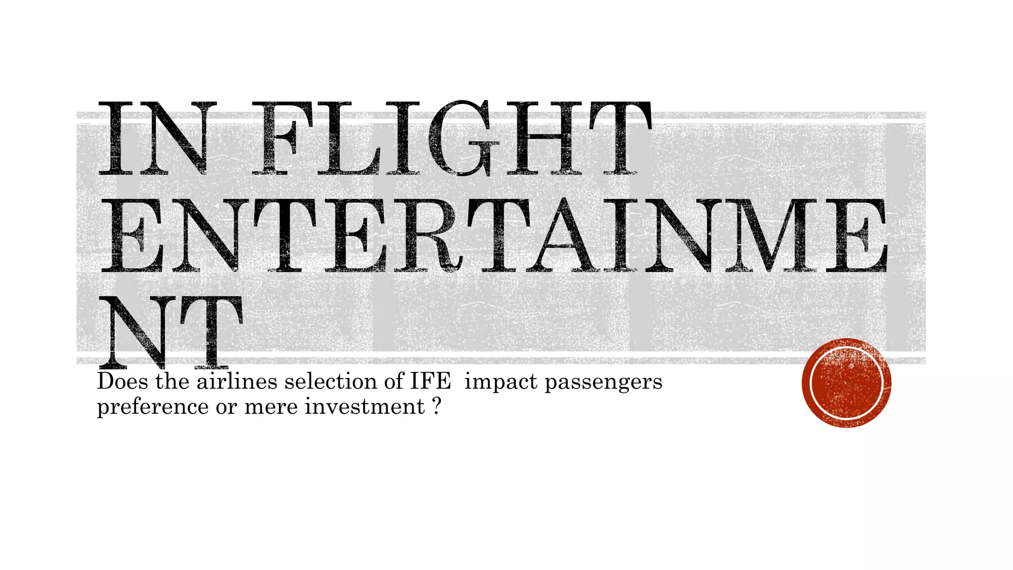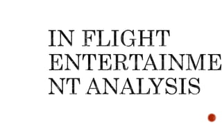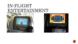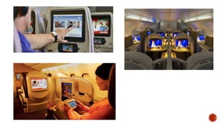 The document discusses in-flight entertainment (IFE) systems used by various airlines. It provides details on the history and evolution of IFE from early radio entertainment to modern personal screens offering movies, TV shows, games and connectivity. Several airlines including Emirates, Etihad, Cathay Pacific are highlighted for their advanced IFE offerings such as touchscreens, WiFi and mobile connectivity. While IFE improves the passenger experience, it also requires significant investment from airlines of $2-15 million per aircraft. Some airlines charge fees for IFE while others include it in ticket prices. Not all passengers select airlines based on IFE as other factors like price and service are also considered.
