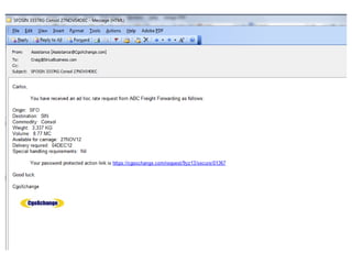 This document discusses getting small air freight forwarders to adopt eFreight. It questions why members of the Air Forwarders Association are avoiding eFreight and whether the industry is ready. It proposes the CgoXchange plan to encourage adoption, including delivering user-friendly air cargo apps through a modern interface and limiting paper interfaces over time. The plan envisions mobile apps when appropriate, with the first app facilitating requests and responses between forwarders, airlines, shippers and truckers. It outlines a future with new apps, customized dashboards, greater mobility, interconnectivity and industry knowledge in real time.