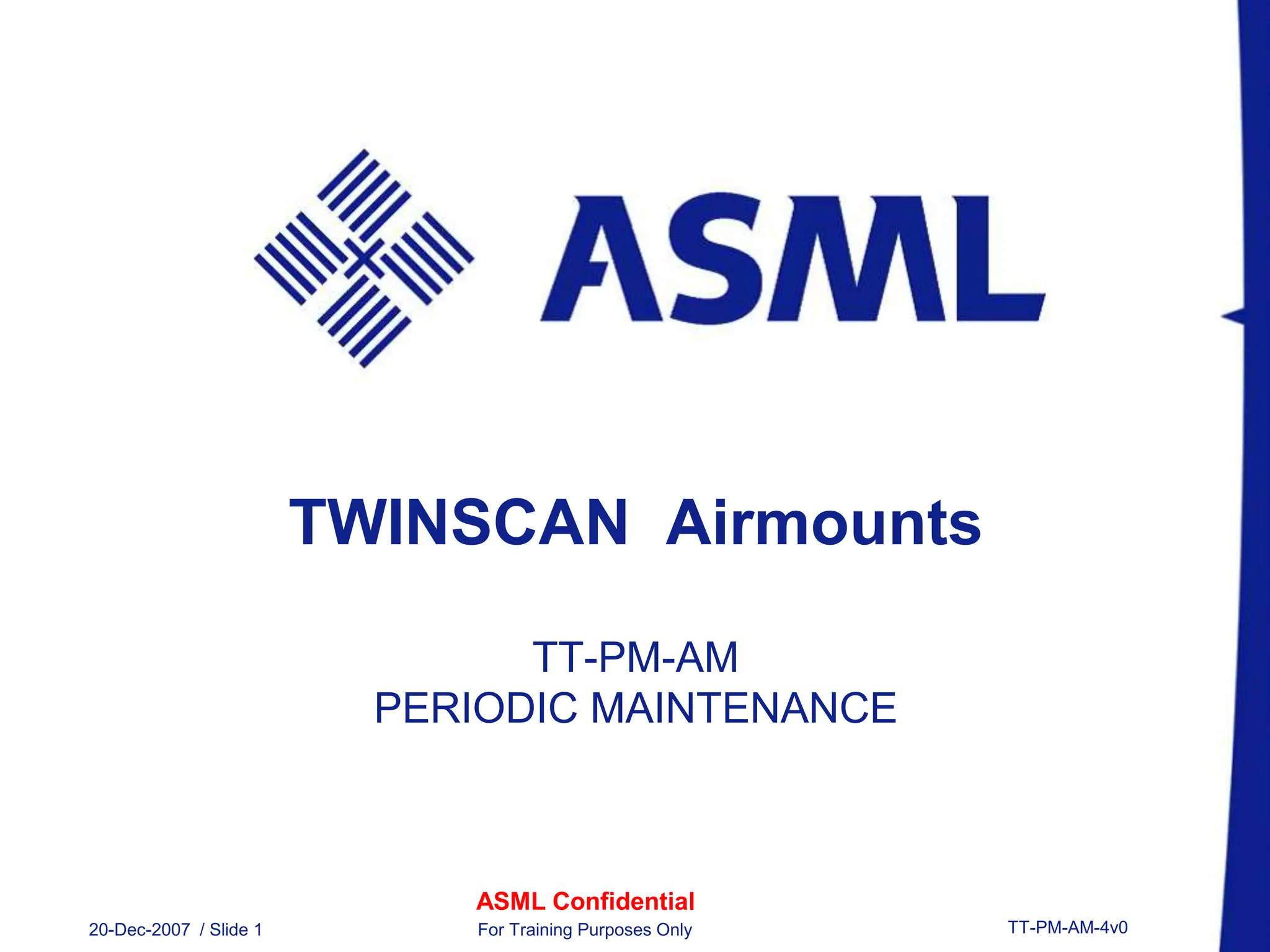 The document is a training guide for ASML's Twinscan Airmounts, detailing the purpose, functions, components, and maintenance activities related to the airmount and palm systems used in the cleanroom. It emphasizes the airmounts' role in isolating the metroframe from vibrations and actively dampening oscillations, along with providing a detailed overview of safety precautions and electronics involved. Additionally, it outlines how to retrieve performance data from the system for periodic maintenance tasks.