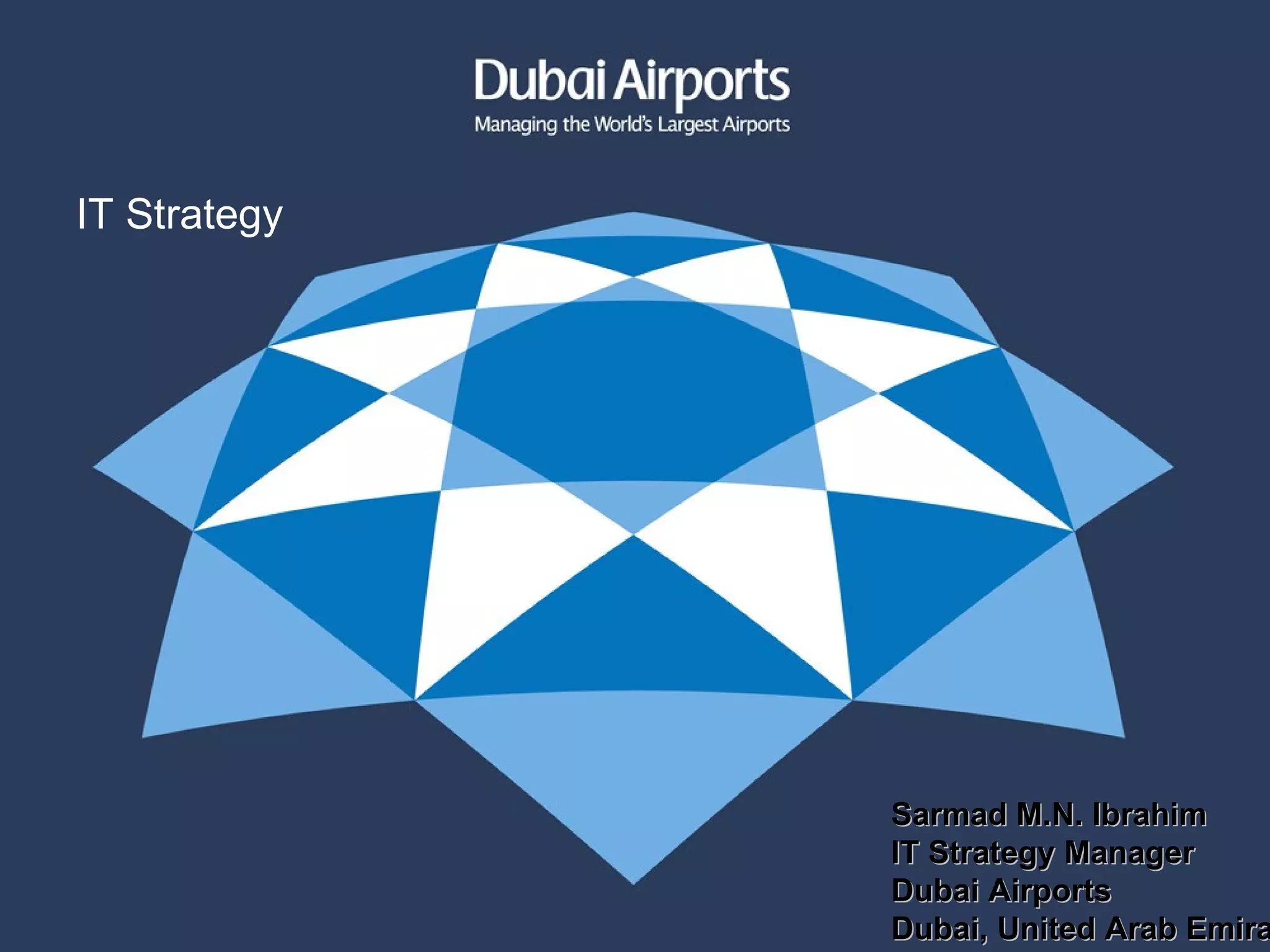 The document discusses Dubai Airports' enterprise architecture (EA) strategy and how it will be used to align business strategy and IT execution, drive operational excellence, and enable purpose-driven innovation. It provides an overview of the key components and perspectives of the EA including business strategy, processes, information, applications, technology, and how they interconnect. The document also defines IT strategy/governance and discusses how it will help analyze changes, identify relationships between initiatives and technology, and ensure components and principles are aligned over time.