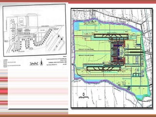This document provides an overview of airports, including their key components and planning processes. It describes the main types of airports as military, civilian, domestic, and international. The main differences between domestic and international airports are described as well. Key airport components discussed include runways, control towers, helipads, hangars, and terminal buildings. The document also covers runway markings, length calculations, corrections for elevation and temperature, lighting, aprons, and the organizations involved in airport planning.
