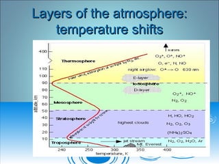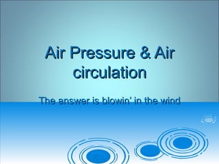 Air pressure and circulation are driven by global patterns of heating and cooling. Warm air rises at the equator and sinks at 30-60° latitude, driving circulation in three main cells. Additional regional patterns arise from pressure gradients, the Coriolis effect, and surface friction. These global and regional wind systems interact with air mass origins to redistribute heat worldwide. Seasonal shifts in insolation cause pressure belts to migrate, altering prevailing winds and weather. Local winds further modify conditions through convection, mountain valleys, and coastal interactions.