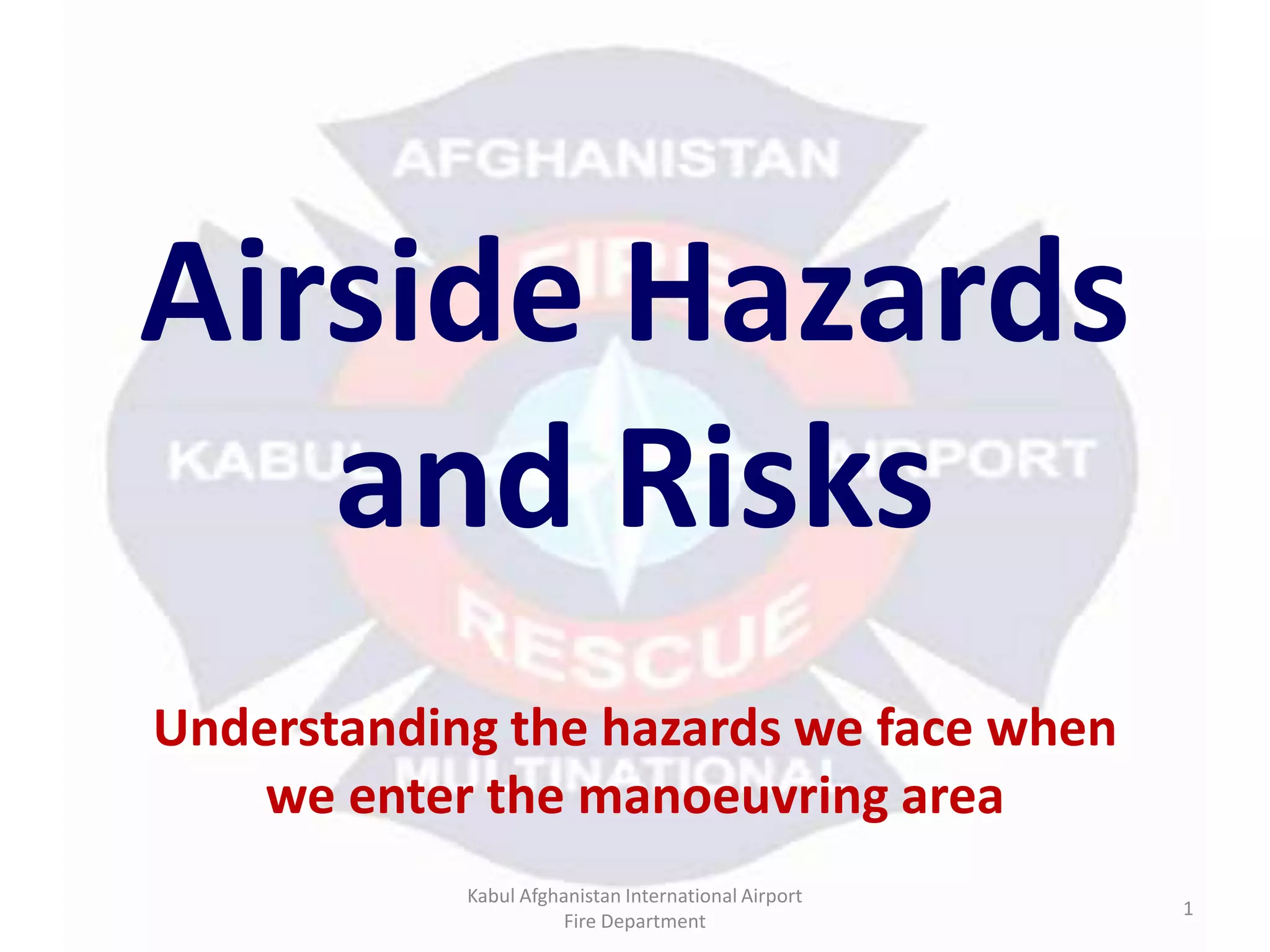 The document provides an overview of airside hazards and risks at Kabul Afghanistan International Airport, aiming to educate personnel about safety around aircraft and common airside hazards. Key hazards include aircraft operations, vehicles, pedestrians, weather, and dangerous goods, along with strategies to address these risks. The emphasis is on ensuring all personnel act in a safe and professional manner when entering the maneuvering area.