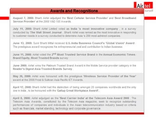 This document provides a summary of the Indian telecom industry and Bharti Airtel, the largest telecom company in India. It discusses Airtel's subscriber growth, value chain, financial analysis, marketing strategies, Porter's generic strategy, BCG matrix, five forces model, and SWOT analysis. Key information about Airtel includes over 88 million subscribers, operations in 23 circles, and revenue of $1.983 billion in Q3 FY09. The telecom industry in India has high competition and customer bargaining power.