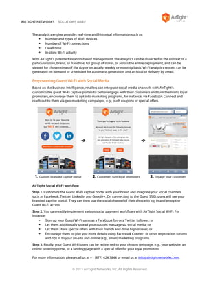 The document summarizes AirTight Networks' Social Wi-Fi solution for retailers. It allows retailers to gain insights into customer behavior through Wi-Fi analytics. It also enables retailers to integrate social media channels into their Wi-Fi captive portals to better engage customers and convert them into loyal promoters. This can help increase revenue and brand equity. The solution provides real-time and historical data on Wi-Fi usage and allows customizing the guest Wi-Fi portal with social login and rewards for promoting the retailer on social media.