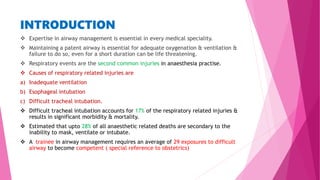 2) Causes of difficult airway include anatomical issues like limited neck movement, swelling, and deformities as well as medical conditions.