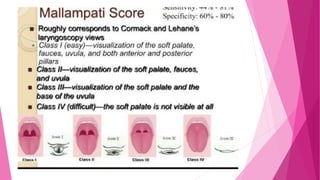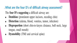 The document provides information on airway assessment and predictors of difficult intubation. It discusses: